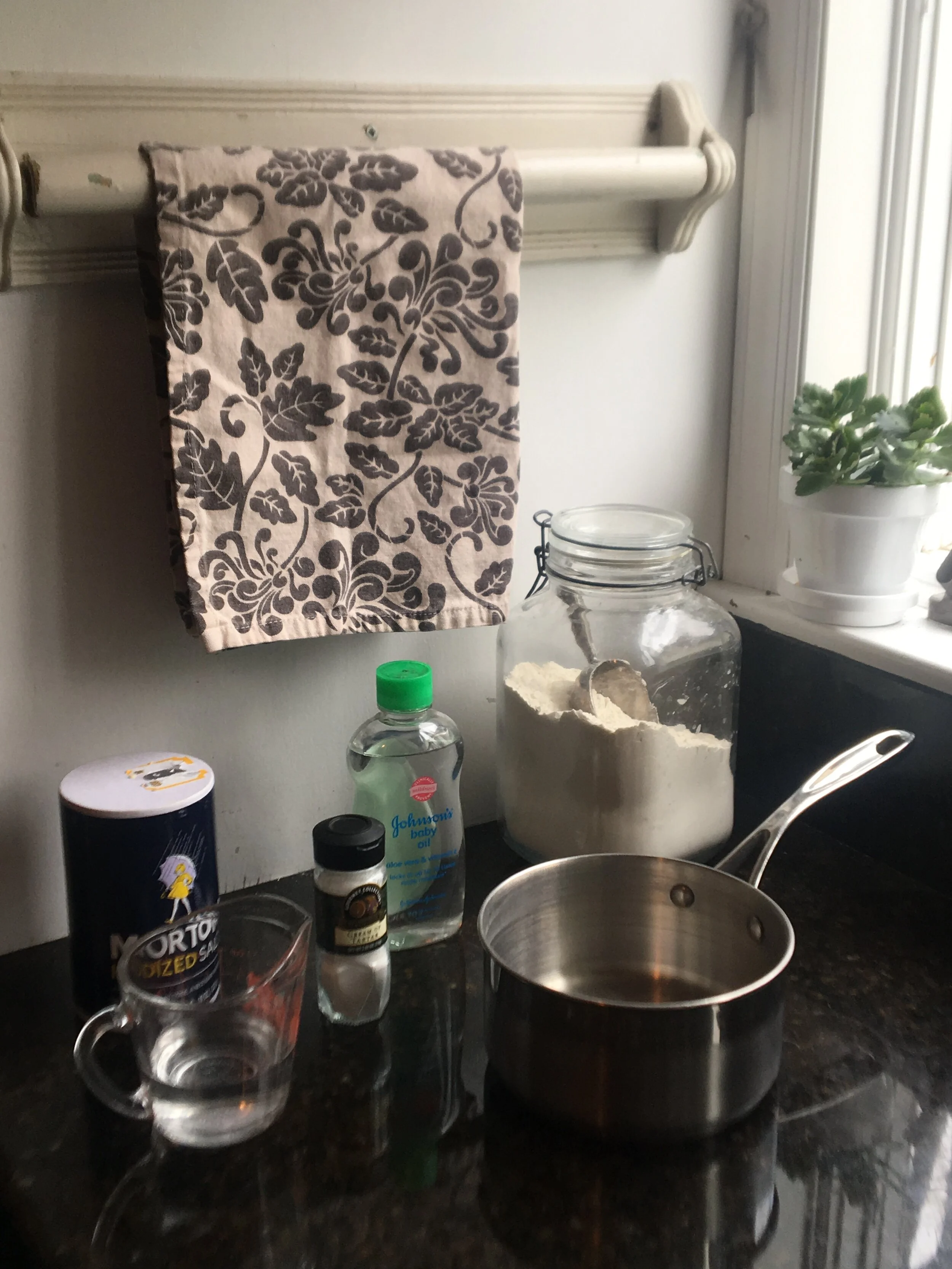 Mix Flour, salt, cream of tartar, and baby oil together in a sauce pan.